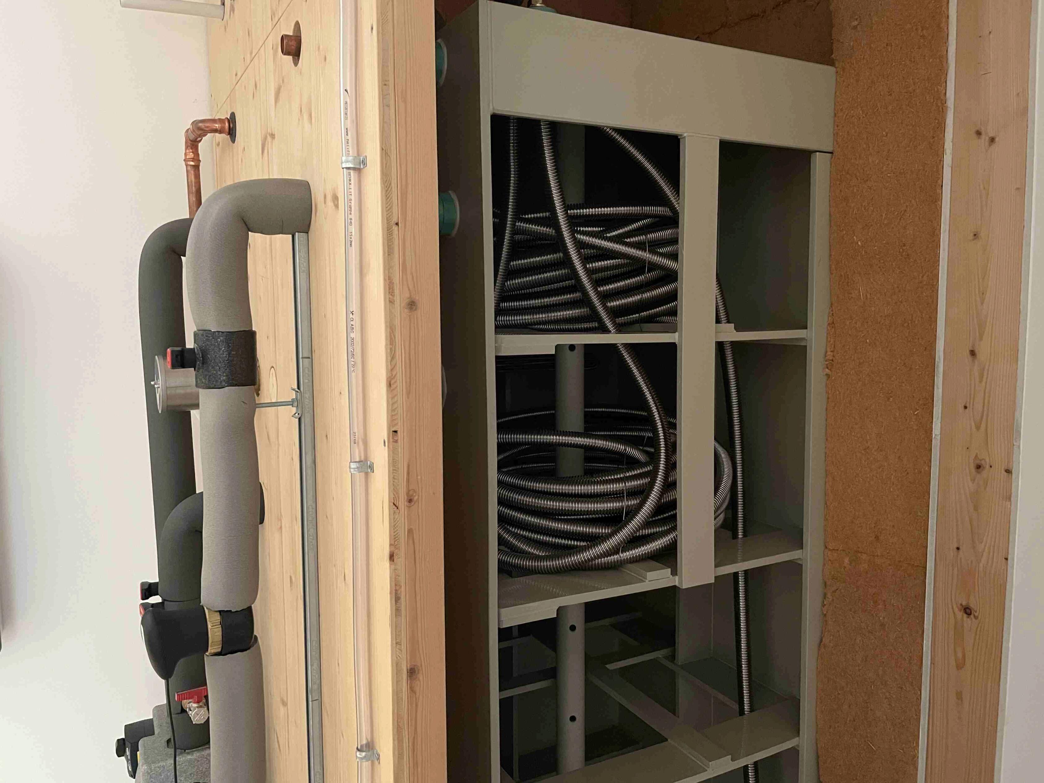 Schon von Anfang an nutzen wir ein druckloses Heizsystem mit einem Kunststoffspeicher, dadurch benötigt man weder ein Ausdehnungsgefäß noch Überdruckventile.