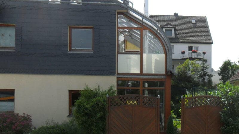 Wir (2 Erw., 1 Kind) bewohnen ein zweistöckiges Haus als Stahlhaus mit Zwiebeldach. Die Außengröße ist 9.90 m x 10.78 m. Die Wohnfläche beträgt 140 m², zzgl. 2 mal 12,5 m² Wintergarten. Als Erstes hat uns damals die besondere Form des Bio-Solar-Hauses angesprochen. Leider haben wir die schönen gebogenen Wände nur im Obergeschoss. An unserem Haus gefällt uns am besten: die außergewöhnliche Form, viel Licht, gutes Raumklima, keine übliche Heizungsluft (wird immer wieder von Besuchern geäußert), im Winter nicht lüften zu müssen, Wintergar