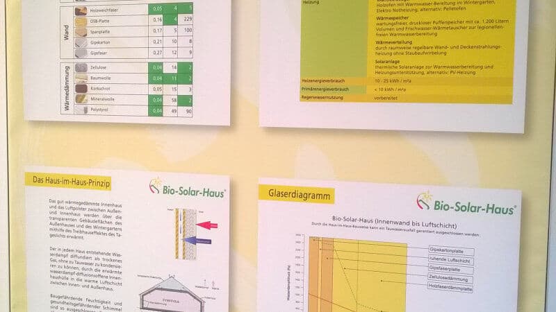 Wandheizung. Ergänzend dazu befinden sich hier auch mehrere Infotafeln über Bau- bzw. Dämmstoffen und Bauphysik sowie eine große Bildergalerie mit Hausbeispielen von bereits realisierten Bio-Solar-Häusern. Im Wintergarten des Informationszentrums befindet sich ein wassergeführter Pelletofen, der in der kalten Jahreszeit die Energie für Heizung und Warmwasser erzeugt.