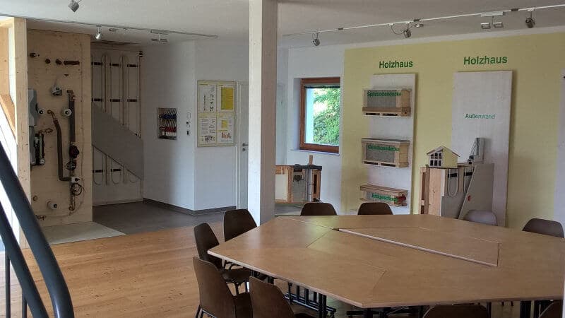 Das Untergeschoss beherbergt den Ausstellungs- und Beratungsraum unserer Musterhausausstellung mit vielen Detailmodellen zur patentierten Haus-im-Haus-Bauweise, u.a. zum Wandaufbau von Innen- und Außenwänden, Decken sowie Fußbodenaufbau. Ergänzend dazu befindet sich auch ein Modell des selbstentwickelten Heizungssystems bestehend aus einem drucklosen Hygienespeicher und der Decken- und